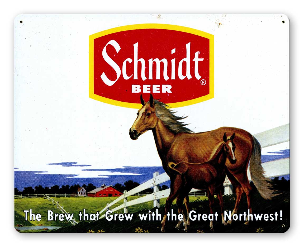 From the American Ikons licensed collection this Schmidt Ad Horses Vintage Metal Sign measures 15 inches by 12 inches and weighs in at 1.73 lb(s). This Vintage Metal Sign is hand made in the USA using heavy gauge American steel.