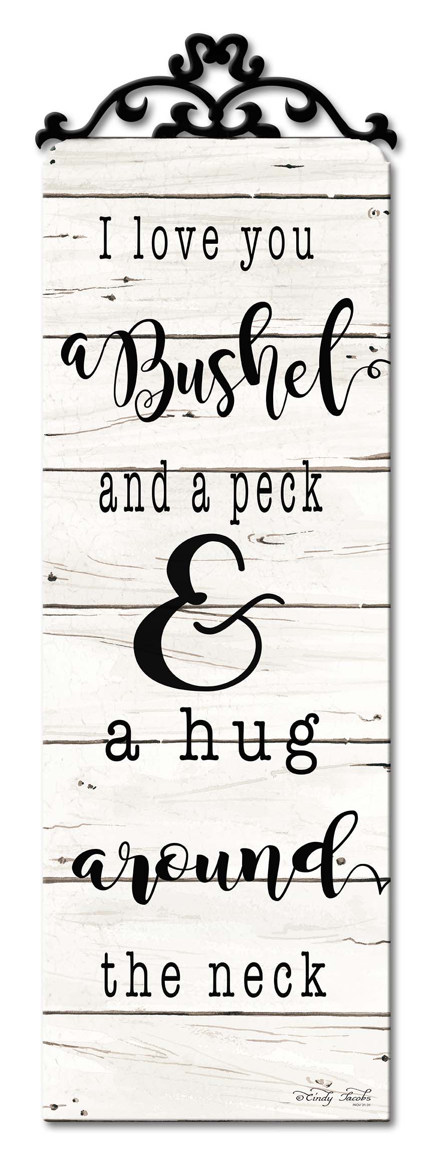 From the Penny Lane sign collection this WHITE Bushel Peck custom shape measures 10 inches by 30 inches and weighs 3lb(s). This sign is hand made in the USA using heavy gauge American steel and a process known as sublimation where the image is baked into a powder coating for a durable and long lasting finish.