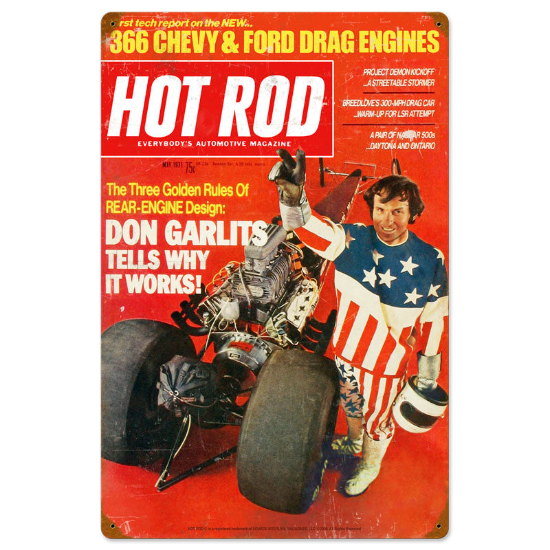From the Hot Rod Magazine licensed collection this Garlits May 1971 Vintage Metal Sign measures 16 inches by 24 inches and weighs in at 4 lb(s). This Vintage Metal Sign is hand made in the USA using heavy gauge American steel.