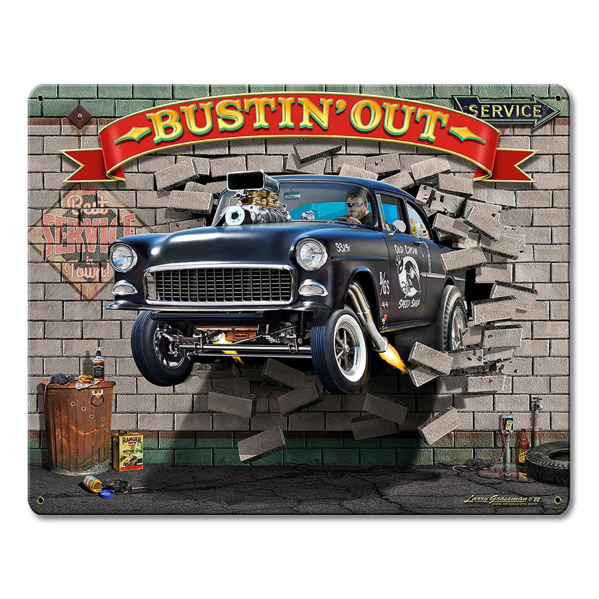 From the Larry Grossman licensed collection this Break On Thru 1955 Chevy Vintage Metal Sign measures 15 inches by 12 inches and weighs in at 2 lb(s). This Vintage Metal Sign is hand made in the USA using heavy gauge American steel.