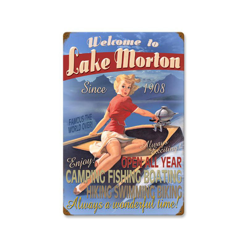 From the Past Time Signs licensed collection this Welcome To Lake Vintage Metal Sign measures 16 inches by 24 inches and weighs in at 4 lb(s). This Vintage Metal Sign is hand made in the USA using heavy gauge American steel.