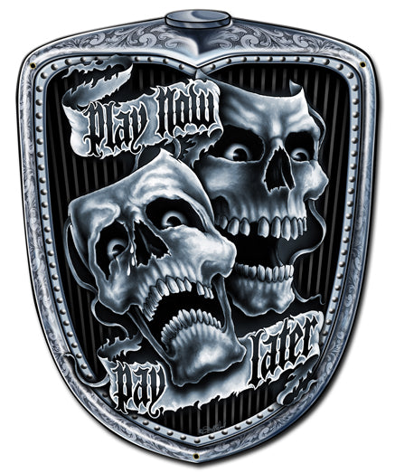 From the Steve McDonald Signs sign collection this Play Now Grill plasma metal sign measures 20 inches by 24 inches and weighs 5lb(s). This sign is hand made in the USA using heavy gauge American steel and a process known as sublimation where the image is baked into a powder coating for a durable and long lasting finish.