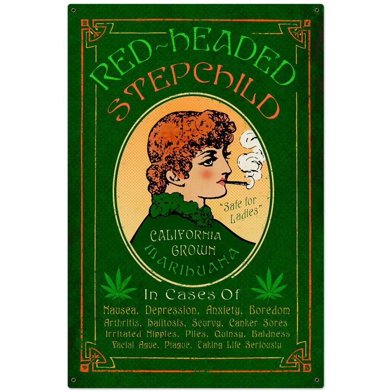 From the Past Time Signs licensed collection this Red Headed Marijuana Metal Sign measures 24 inches by 36 inches and weighs in at 10 lb(s). This Metal Sign is hand made in the USA using heavy gauge American steel.